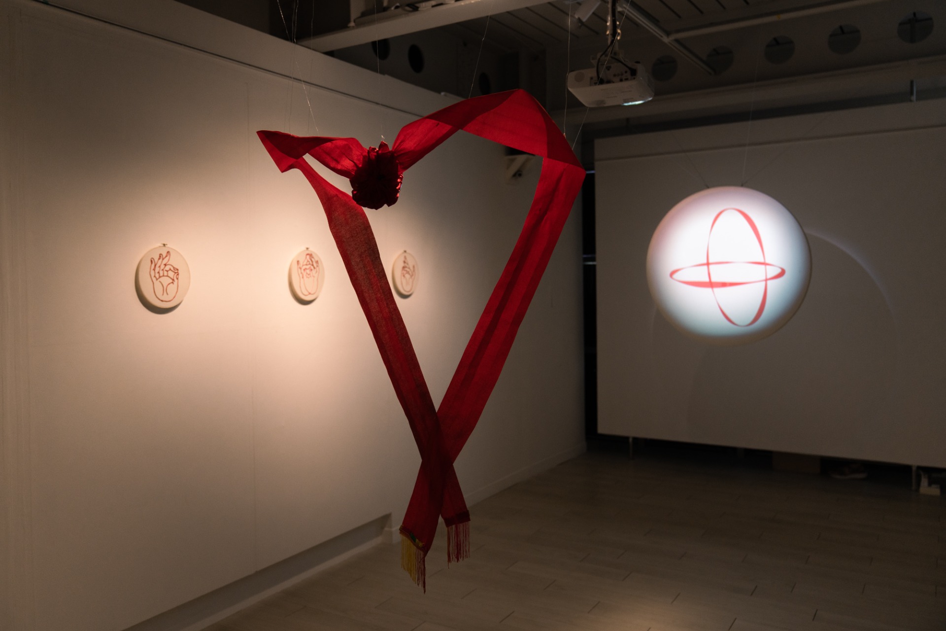 刺繡強調手工對齊,每一針線的細微差異,體現人為溫度與情感流動。三種手印的運用,象徵內在專注與自我調頻,如同冥想時意識的凝聚。 作品名稱「二弦門」寓意穿透與通道,也指涉愛與靈性的連結。此作在物質與數學、儀式與感知之間展開張力,配合互動裝置結合感測器,邀請觀者能主動調整影像中雙環的視角,參與一場穿越與對齊的心靈對話。