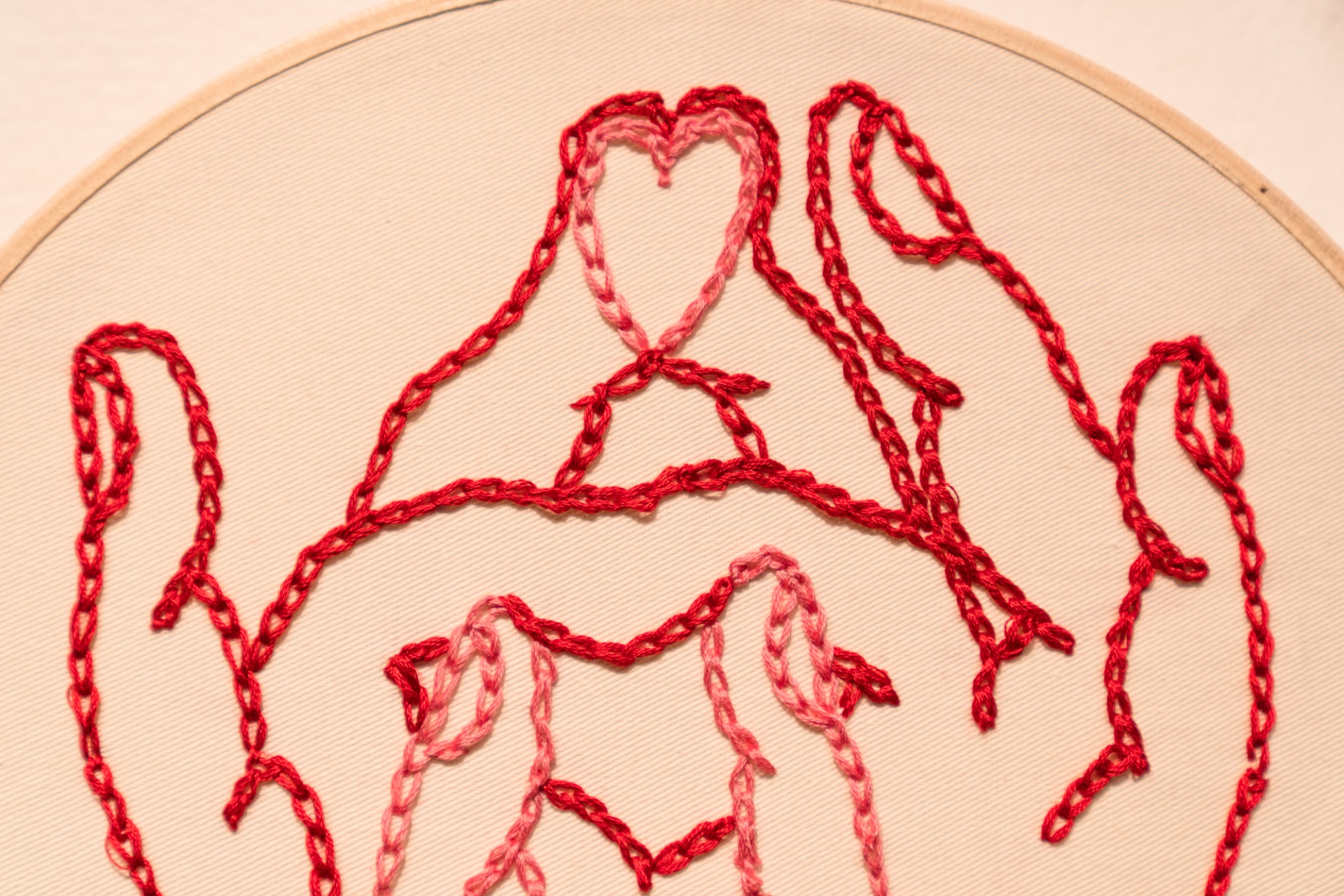 Embroidery highlights the subtle human touch in each aligned stitch, expressing warmth and emotion. The use of three hand gestures symbolizes inner focus and attainment, echoing the meditative process.