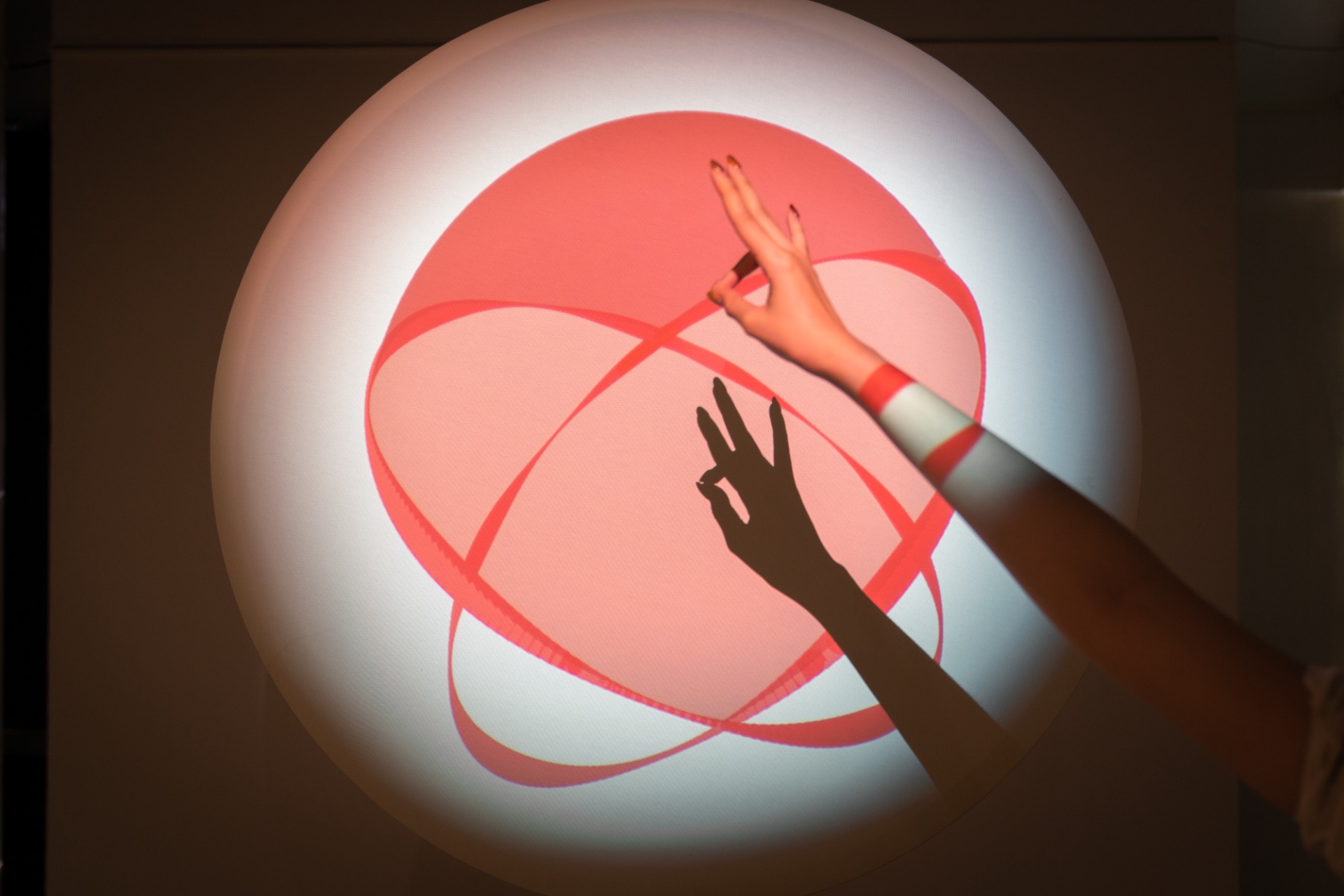 Interactive sensors allow viewers to shift the perspective of the dual rings in the projected imagery, inviting participation in the spatial poetics of "love" and "gate."